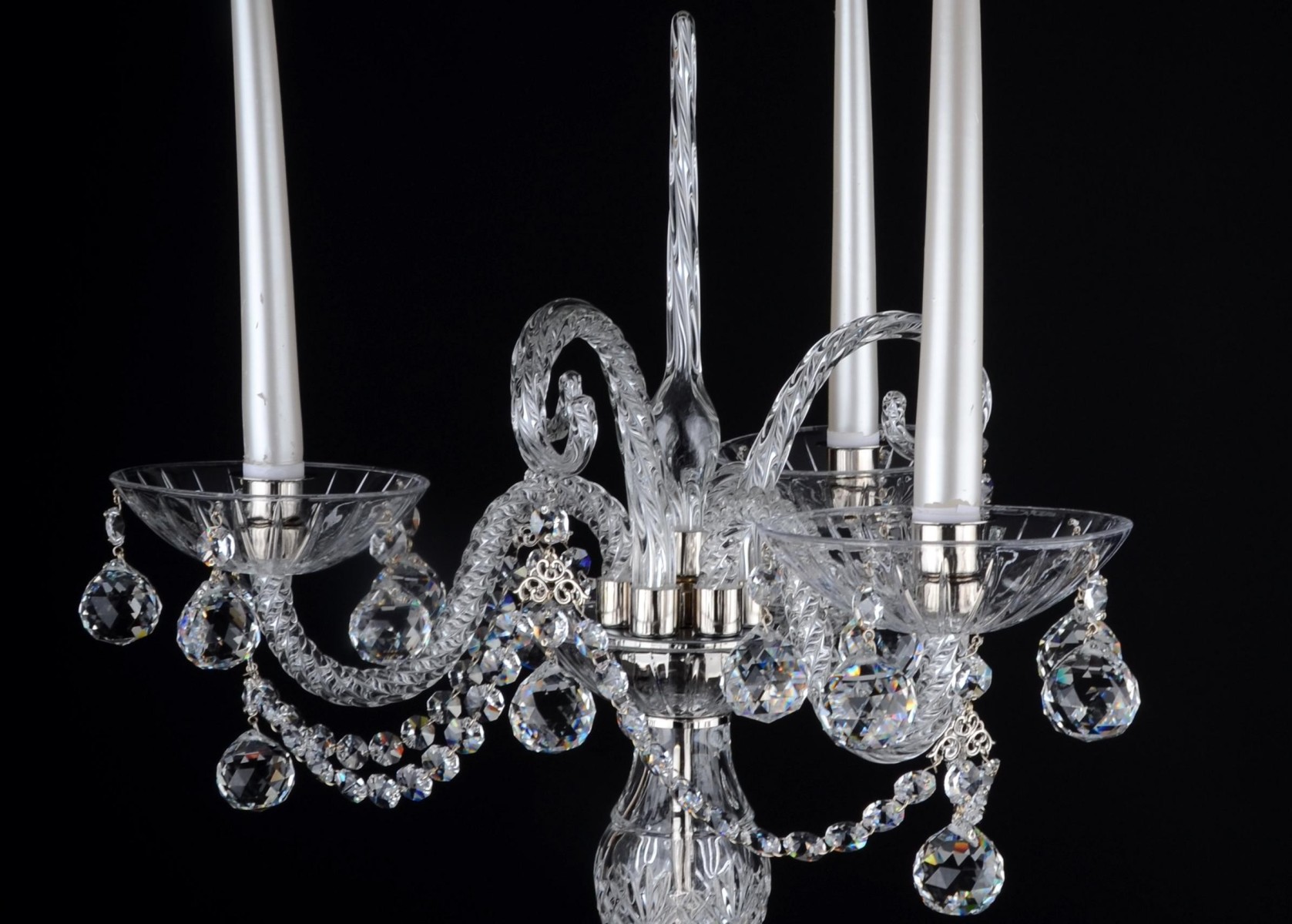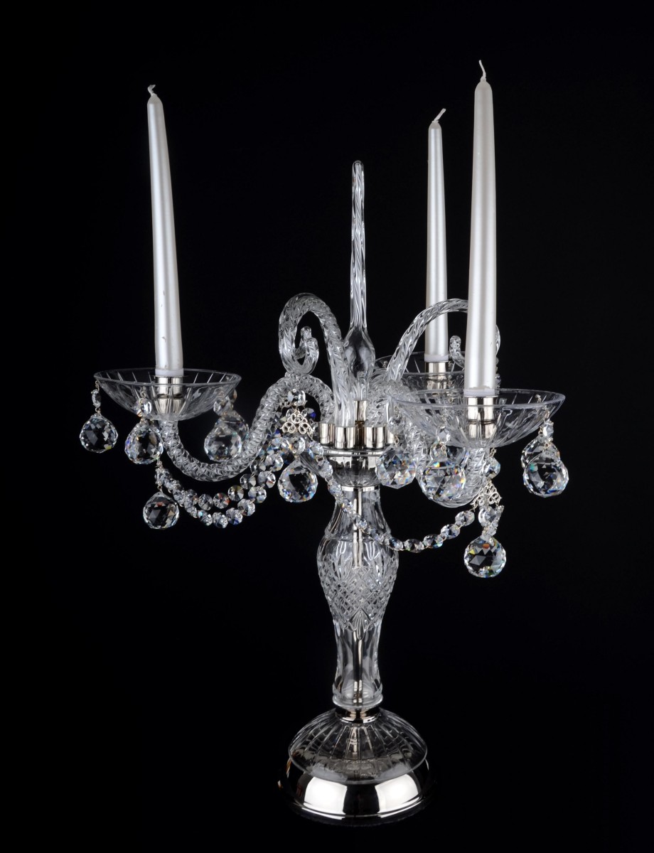 The silver candlestick with 3 glass arms decorated with crystal balls and the design glass horns.