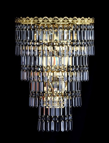 High golden crystal light for wall mounting decorated with cut rectangles and pointed lead glass prisms. The pointed cut trimmings are complemented by square stones. Inside the wall light are four candle bulbs.