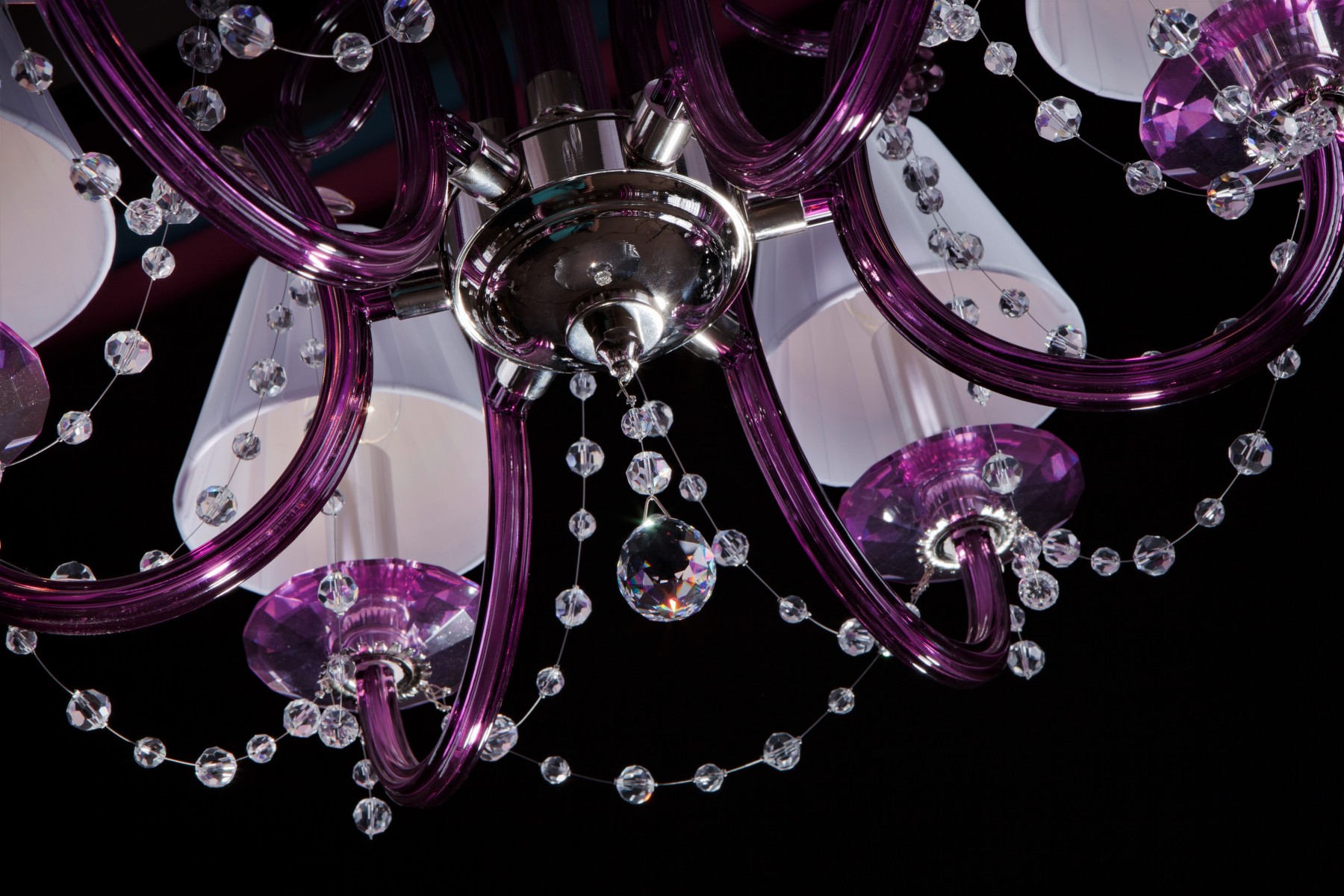 6-arm modern purple chandelier with crystal pearls & lampshades