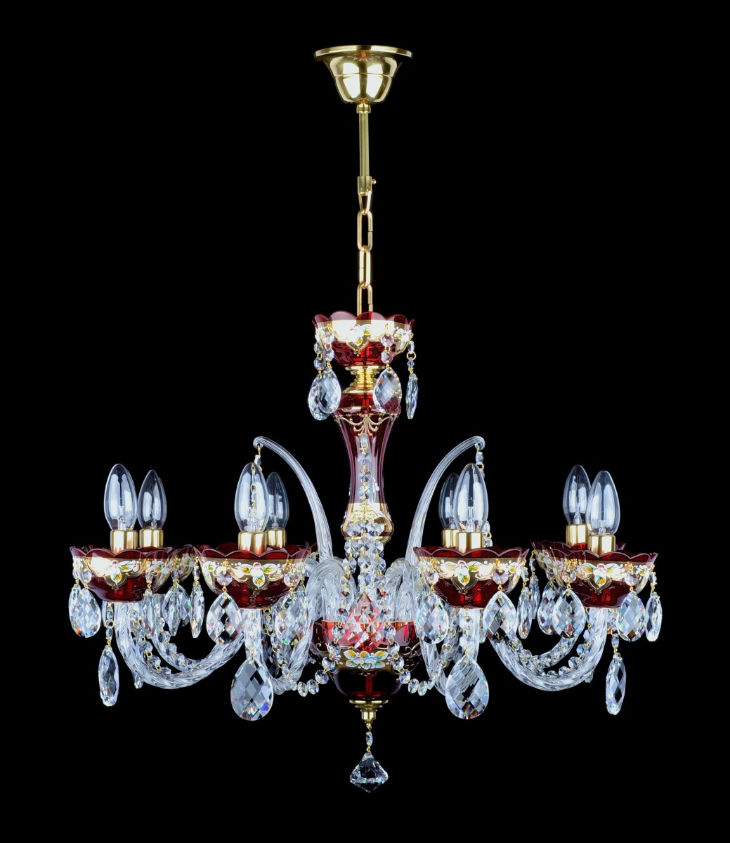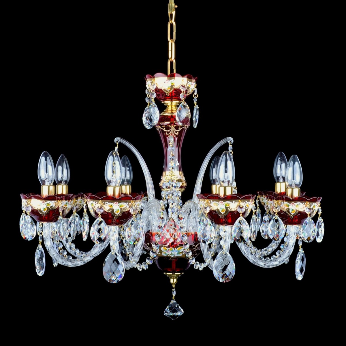 Traditional ruby chandelier with eight twisted arms, glass corners, decorated with crystal almonds and a crystal pyramid. The dark red glass is decorated with hand painting and flowers made of high enamel (finely ground glass with metal oxide melted in a furnace). These chandeliers with a distinctive ruby red color are especially suitable for the living room, which will add warmth and coziness. A smaller ruby chandelier is also suitable for the bedroom, to create a romantic atmosphere for couples. Larger ruby chandeliers decorated with gold are also suitable for establishments such as luxury hair salons, pastry shops, delicatessens, etc.