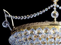 The basket crystal chandelier decorated with cut crystal balls. The glossy brass parts. 9 candle bulbs.