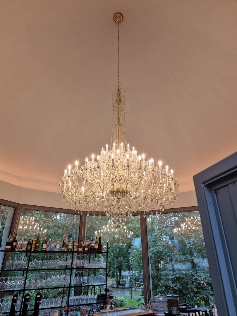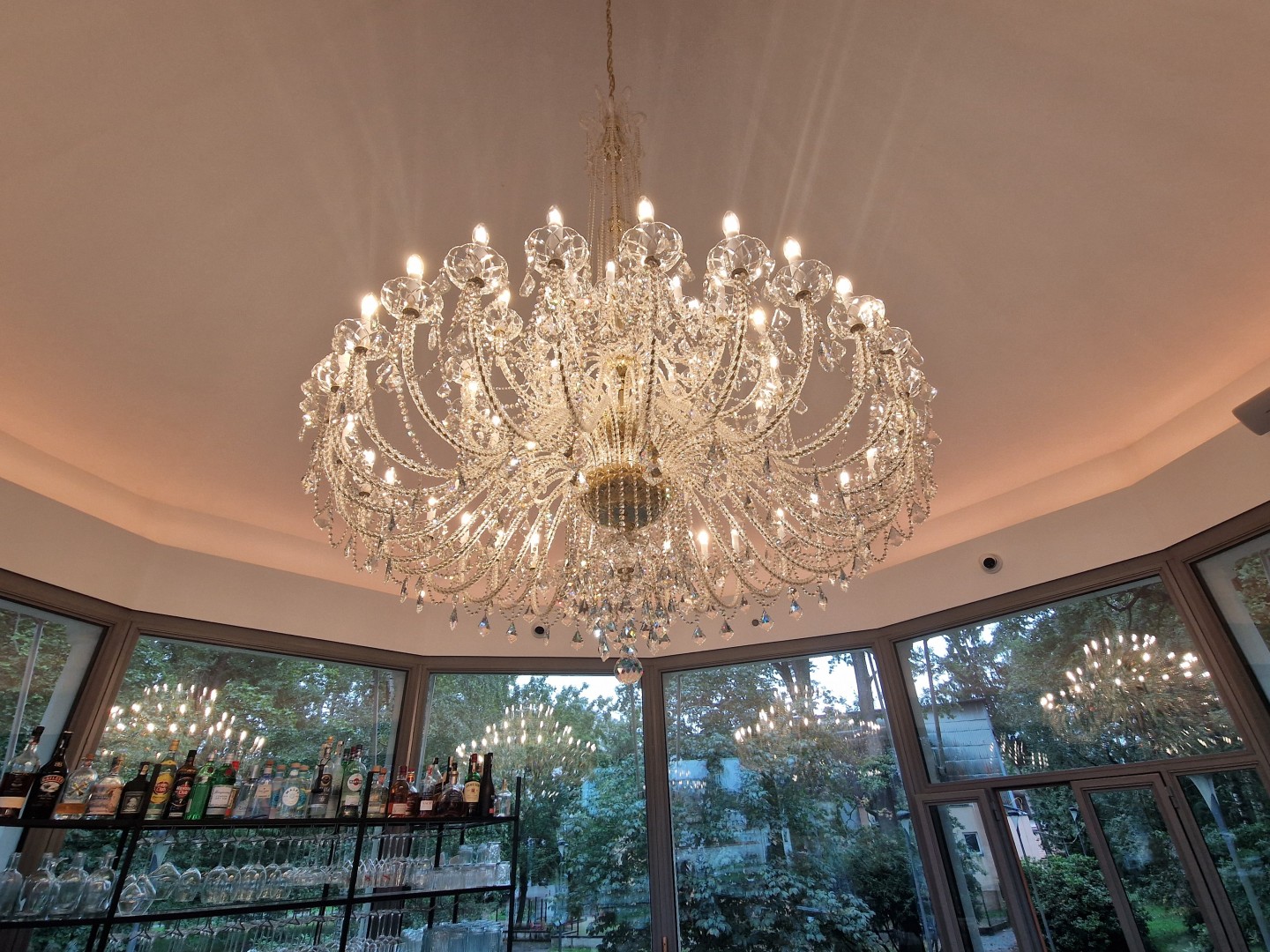 Chandelier service at the customer's place - a large crystal chandelier with 60 bulbs in the gazebo of Café Hajecek.