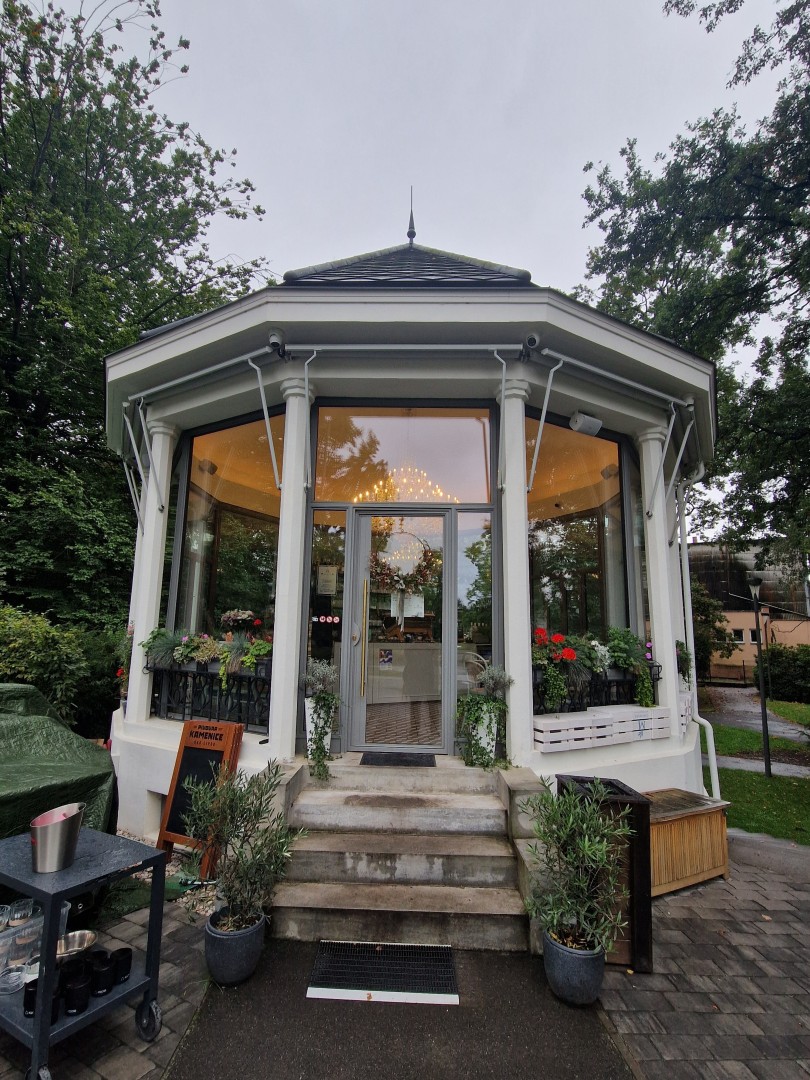 Cleaning a large crystal chandelier in the gazebo of Café Hajecek in the park by the river in Ceské Budějovice.