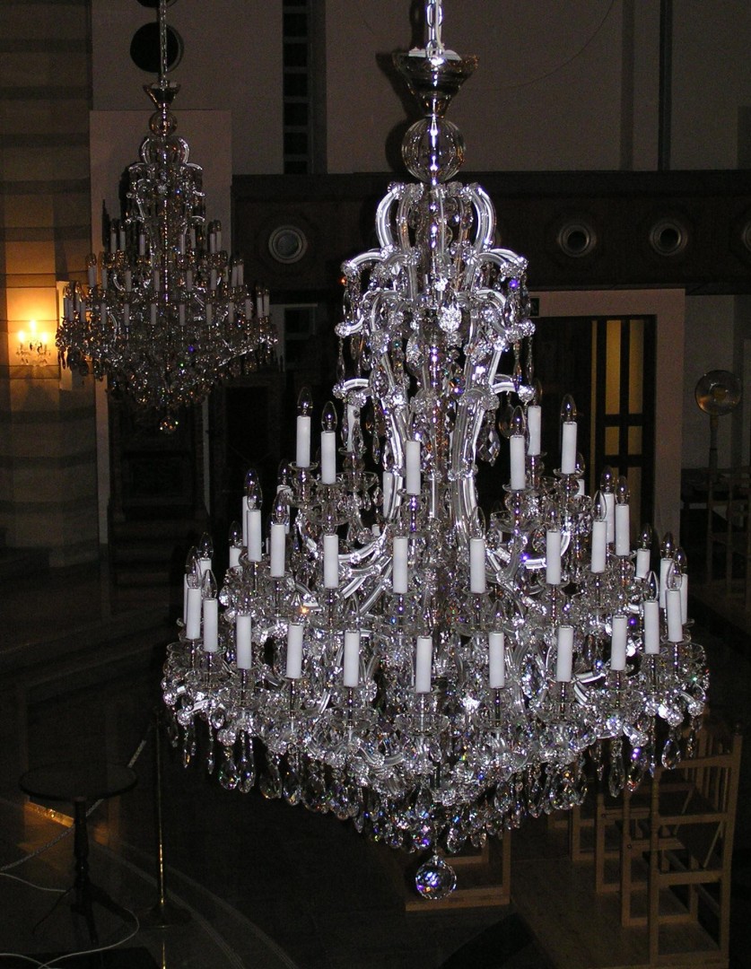 Installation of large Theresian chandeliers in a church on the island of Cyprus