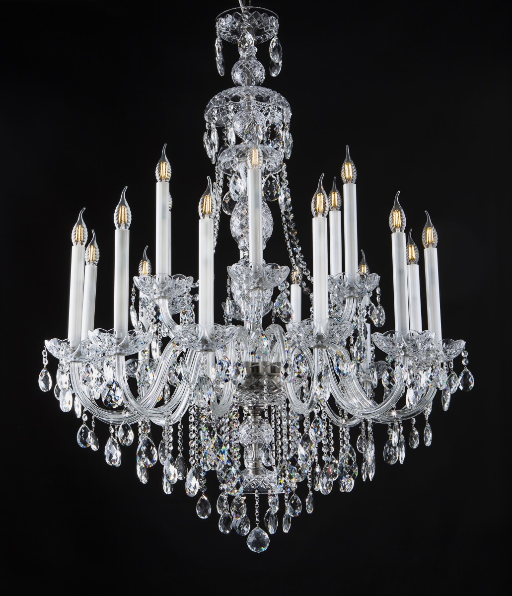 18 profiled resistant glass arms. Large Victorian crystal chandelier with long candles in French style. All parts of the chandelier are made of hand-blown and hand-cut crystal glass. The metal parts of the chandeliers are made of matte silver plated brass, suitable for antique interiors and minimalist modern interiors. The less prominent silver color is neutral and can be easily combined with different styles of furniture, similar color of picture frames and mirrors, etc